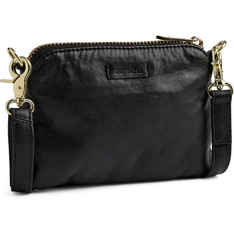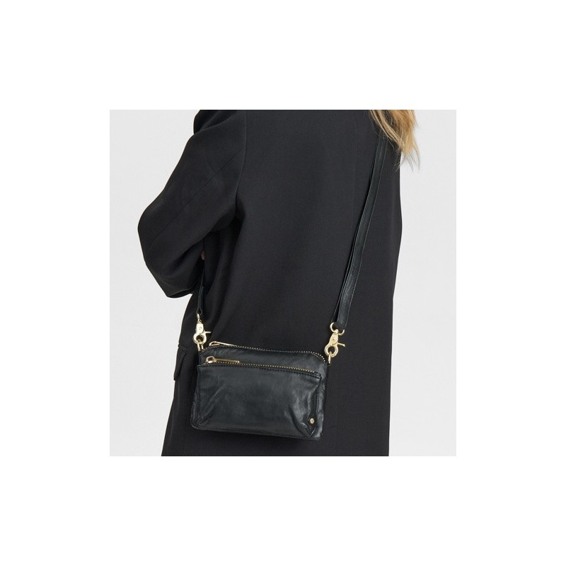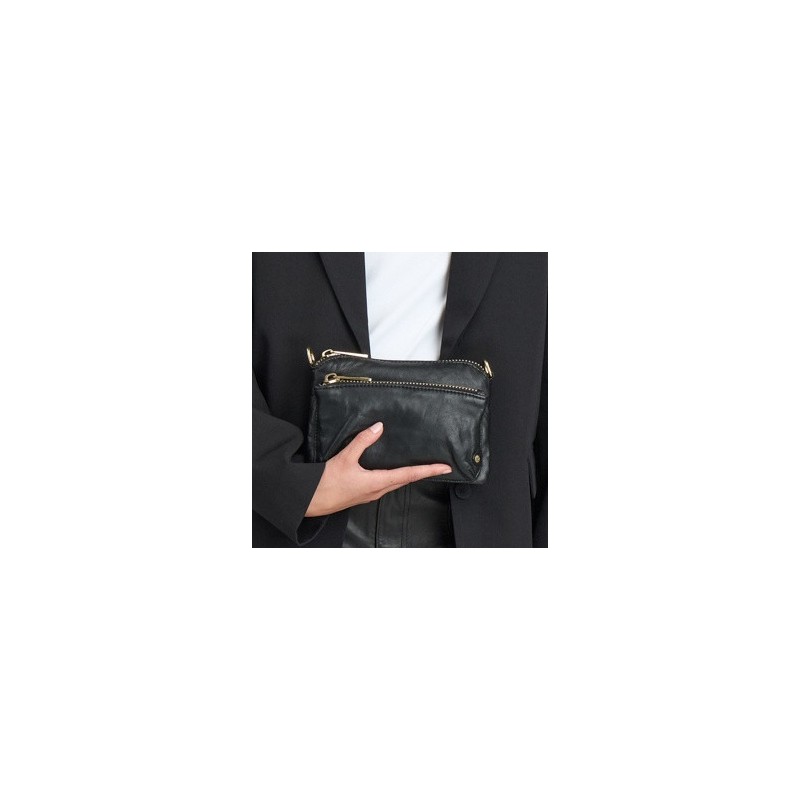 Elegant crossover/clutch fra Depeche i blødt sort lammeskind med guldfarvet lynlås. Tasken kombinerer funktionalitet og minimalistisk stil, perfekt til både hverdag og fest. To separate rum giver nem organisering af essentials som mobil, kort og nøgler. Justérbar/rem kan tages af, brug den som crossbody eller som clutch efter behov.