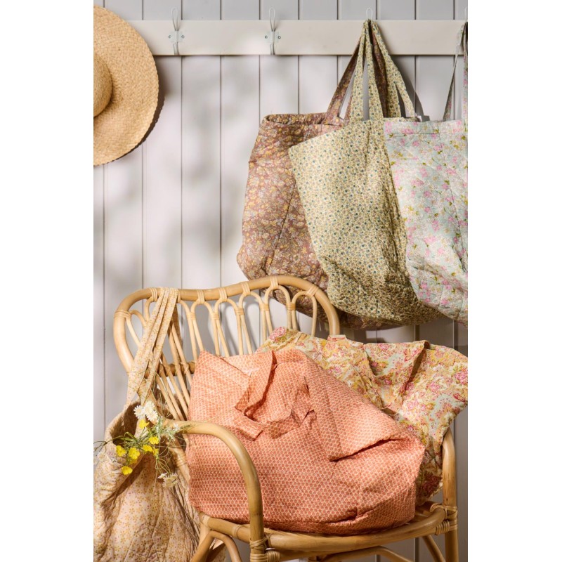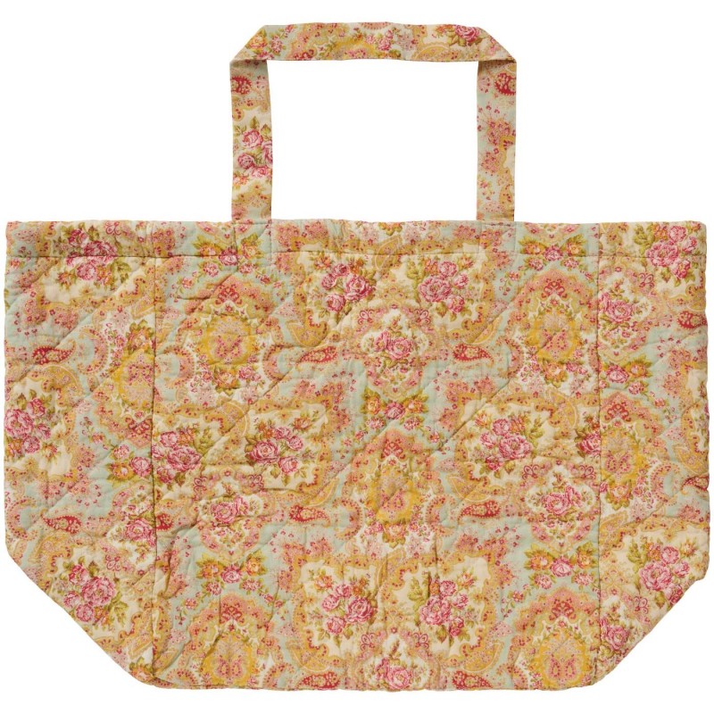 Rummelig quiltet taske fra Ib Laursen i lys blå med smukt paisley- og blomstermønster i lyserød, rød, grøn og gul. Den bløde bomuldstaske er let polstret og ideel til både arbejde, træning, indkøb eller en tur på stranden. En praktisk og dekorativ følgesvend til hverdagen.