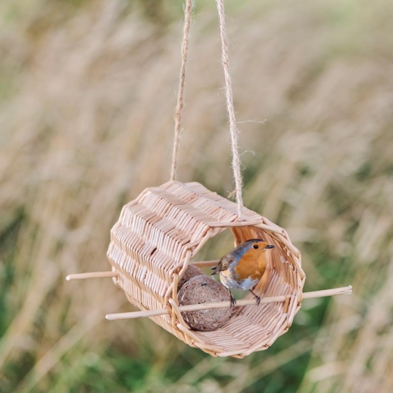 Tilføj charme og funktion til haven med dette håndlavede fuglefoderophæng fra Ib Laursen. Udført i flettet pil, har det to praktiske siddepinde samt en jutesnor for nem ophængning. Den cylinderformede konstruktion beskytter foderet mod vejret og giver småfugle et roligt sted at spise – både dekorativt og nyttigt året rundt.