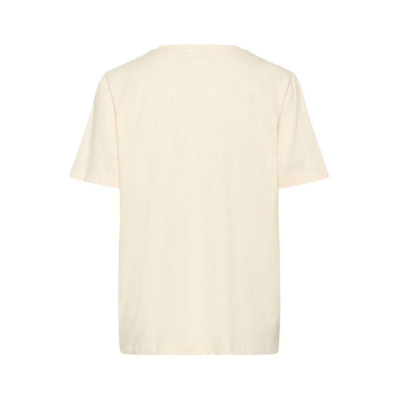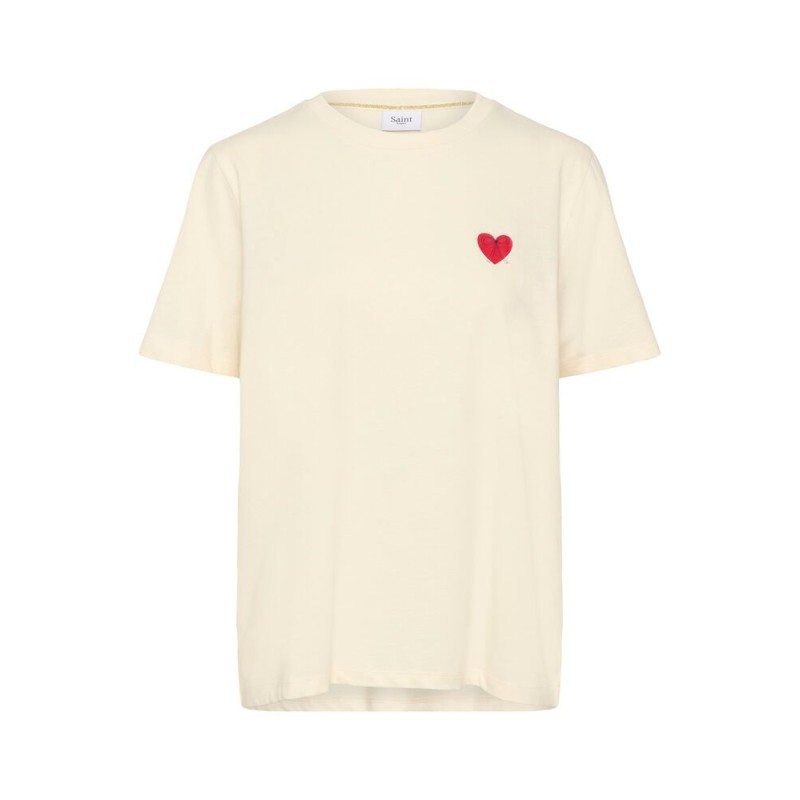 T-shirt "PextanSZ" fra Saint Tropez er en stilfuld og casual tilføjelse til garderoben. Den kommer i en råhvid farve med et charmerende rødt hjerteprint med sløjfe i, der tilfører et feminint og personligt touch. T-shirten har en klassisk pasform og rund halsudskæring – perfekt til både hverdag eller under en blazer for et afslappet, cool look.