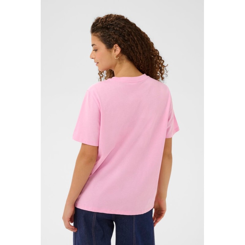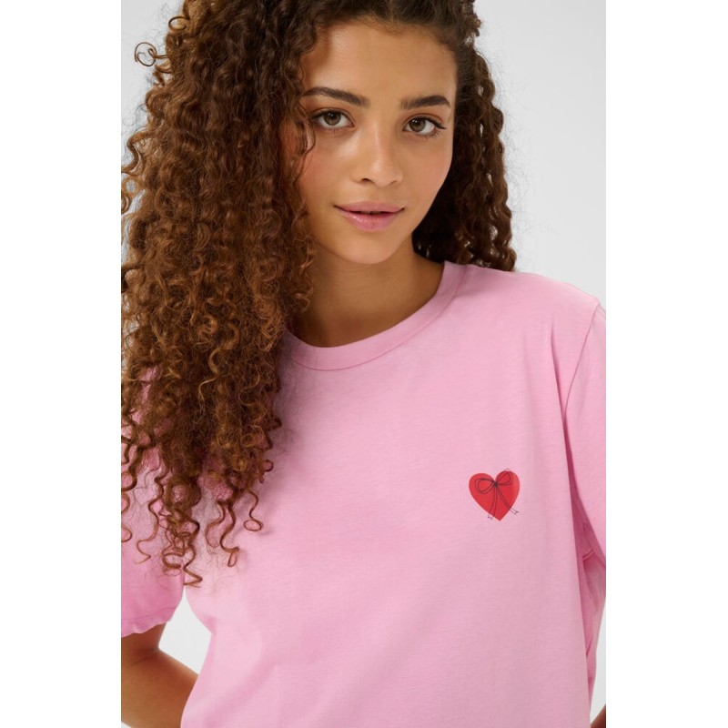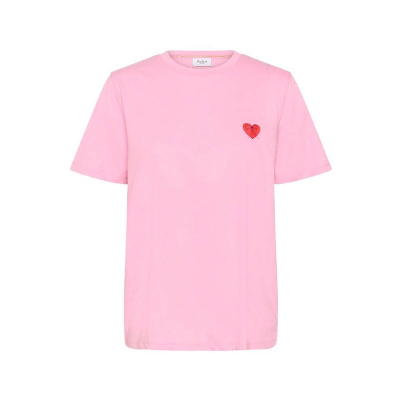 Opgrader din basisgarderobe med T-shirten "PextanSZ" fra Saint Tropez. Denne lyserøde t-shirt prydes af et sødt rødt hjerte med en sort sløjfedetalje, der tilføjer et feminint og stilrent udtryk. Fremstillet i blød kvalitet for optimal komfort – perfekt til både hverdag og afslappede anledninger.