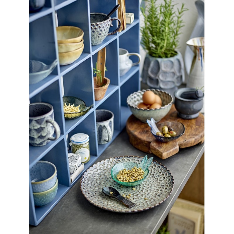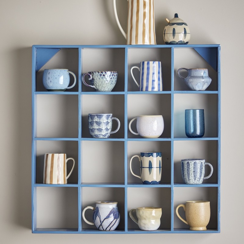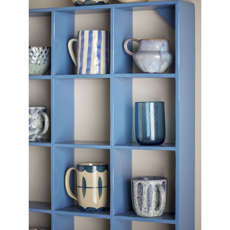 Bekka væghylden fra Bloomingville er en dekorativ og funktionel opbevaringsløsning i blåmalet, genanvendt træ. Med sine 16 små rum egner den sig perfekt til udstilling af krus, kopper, skåle eller nipsting. Hyldens unikke håndmalede finish giver et varmt, personligt præg og gør hvert eksemplar helt særligt.