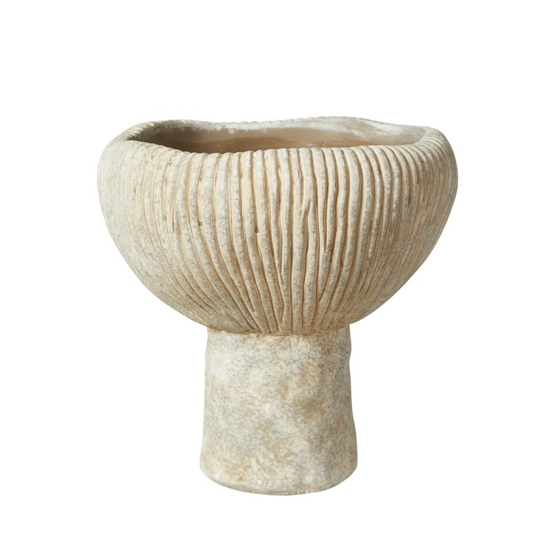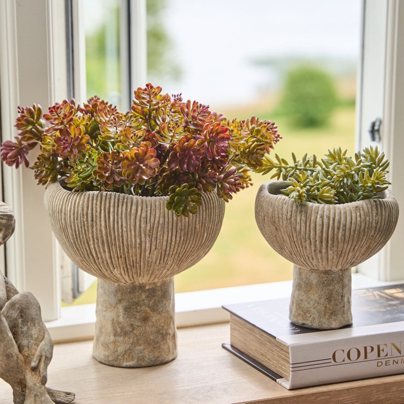 Denne elegante vase/skjuler fra Speedtsberg er udført i rillet cement med fod og en flot, organisk form. Den vandafvisende overflade gør den velegnet til dekorativ brug, men da materialet ikke er helt vandtæt, anbefales inderskål eller kunstige blomster. Perfekt som stilfuld detalje i hjemmet. Se også den store!