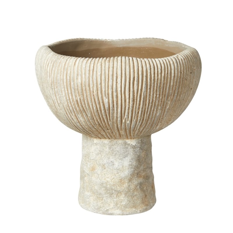 Vase/skjuler på fod i rillet cement fra Speedtsberg med et elegant, skulpturelt udtryk. Den rillede overflade giver et råt og moderne look, mens højden på 20 cm gør den velegnet som dekorativ detalje i hjemmet. Behandlet med vandafvisende maling, men ikke 100% vandtæt – brug derfor inderskål eller kunstige blomster. Se også den lille.
