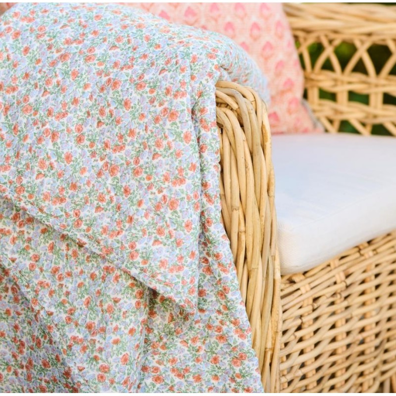 Skab hygge med dette smukke quilt / vattæppe fra Ib Laursen. Tæppet er fremstillet i blød bomuld og prydet med et romantisk blomsterprint i lyseblå og rustfarvede nuancer. Perfekt som et tæppe til afslapning indendørs eller som lunende lag på kølige aftener udendørs. Et stilfuldt valg til enhver boligindretning.