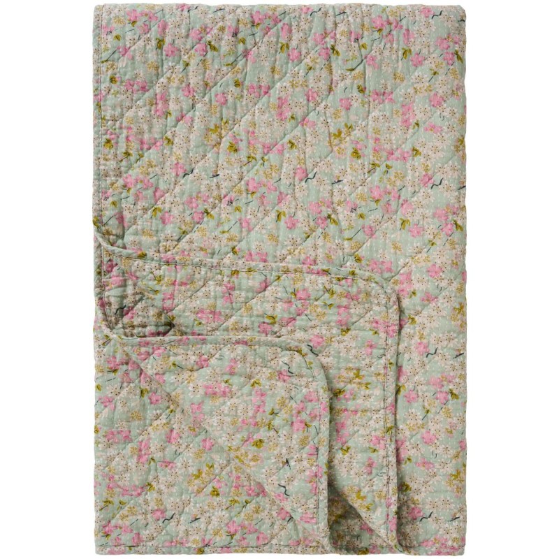 Blødt og dekorativt quiltet vattæppe fra Ib Laursen i en smuk støvet blå bomuldskvalitet med blomsterprint i lyserøde, grønne og grå nuancer. Det lækre tæppe på 130x180 cm er både hyggeligt og stilfuldt – perfekt som ekstra varme i sofaen eller på terrassen til at skabe ægte sommerstemning.