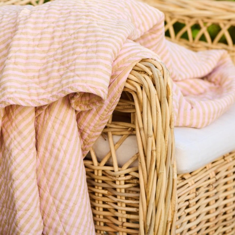 Tilføj varme og stil til dit hjem med denne bløde quilt fra Ib Laursen. Vattæppet har smalle striber i mustard og lyserød, der skaber et hyggeligt udtryk. Perfekt som let vattæppe på kølige aftener eller som dekorativt plaid over sofaen eller sengen – en alsidig detalje til enhver boligindretning.